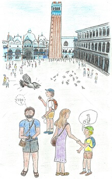 Kam jít? Vůbec to tady neznáme, půjdeme tedy s davem. A šli jsme. Horko bylo téměř nesnesitelné, snad 45 stupňů, a všude davy a davy lidí. Každý chtěl vidět Benátky. Došli jsme až na náměstí svatého Marka a opět davy lidí, a navíc hejna holubů. Rozhlíželi jsme se kolem a čekali, až se dostaví ten úžasný pocit okouzlení a obdivu. Nic z toho však nepřicházelo, všechno bylo sice krásné, velkolepé a jedinečné, jenže my jsme v tom horku spíš toužili po příjemném stínu, klidném zákoutí a vychlazené limonádě.