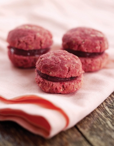 Polovinu sušenek namažte malinovým krémem nebo krémem s jinou příchutí. Namazané sušenky přiklopte nenamazanými a lehce je stlačte k sobě, abyste vytvořili sušenkový makronkový sendvič.